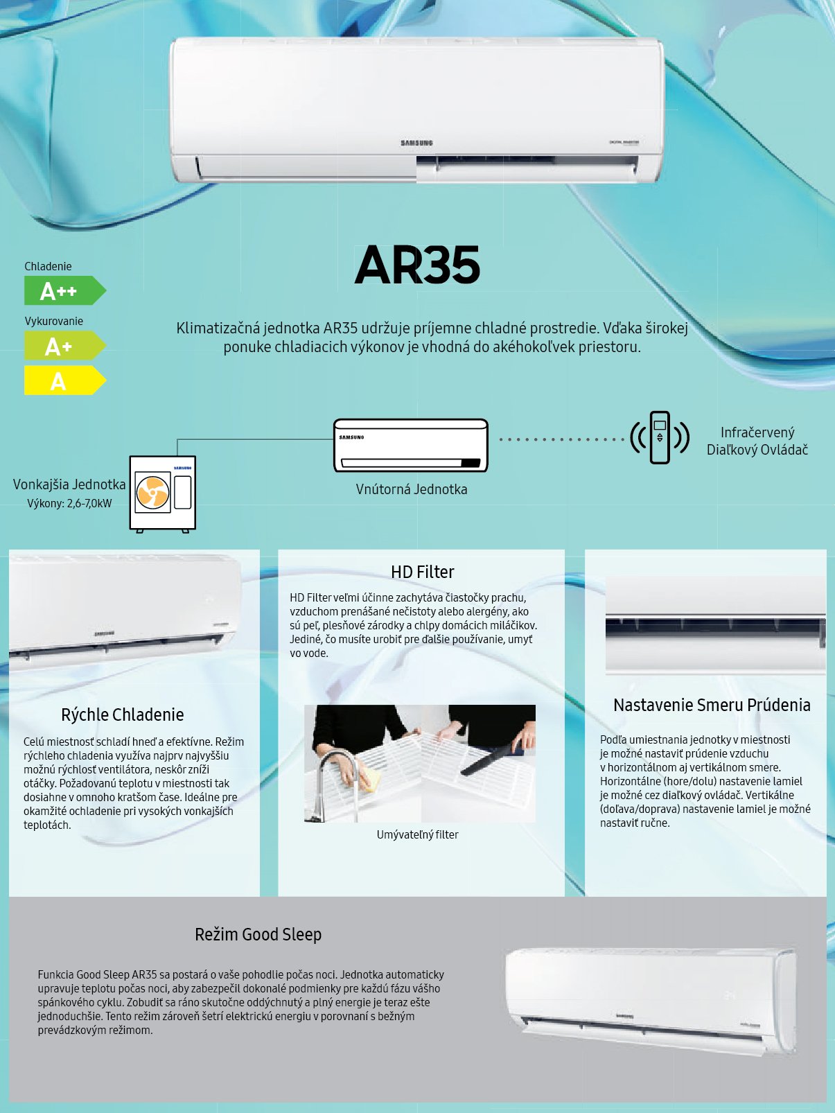 Samsung AR35 je základná invertorová klimatizácia, ktorá ponúka spoľahlivý výkon, úsporu energie a funkcie pre rýchly komfort. Je navrhnutá tak, aby zabezpečila dlhú životnosť a čistý vzduch.