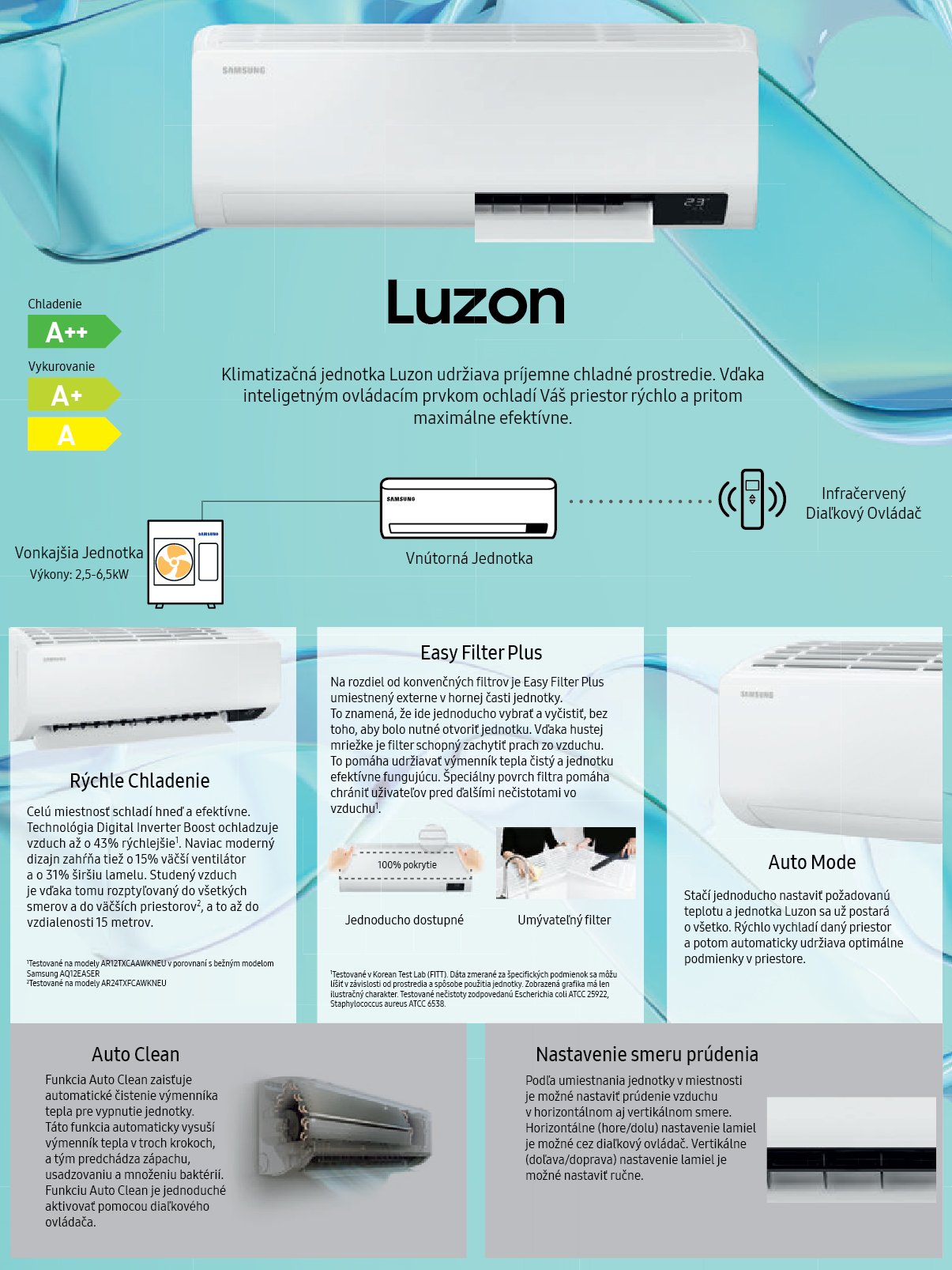Samsung Luzon S2 – spoľahlivá a tichá klimatizácia (19 dB) s rýchlym chladením a funkciami zameranými na dlhú životnosť a hygienu.